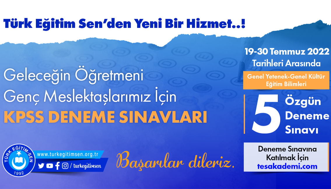 Konuyla ilgili açıklama yapan Türk Eğitim-Sen Genel Başkanı Talip Geylan, sendikamızın  www.tesakademi.com adlı online bir eğitim platformu kurarak üyelerimize yönelik sınavlara hazırlık eğitimleri, elektronik kitap desteği ve deneme sınavları hazırladığını hatırlatarak, bu kapsamda genç meslektaşlarımızın talebi üzerine Türk Eğitim-Sen’in KPSS hazırlık sürecinde öğretmen adaylarına deneme sınavları hizmeti vermeye karar verdiğini söyledi.